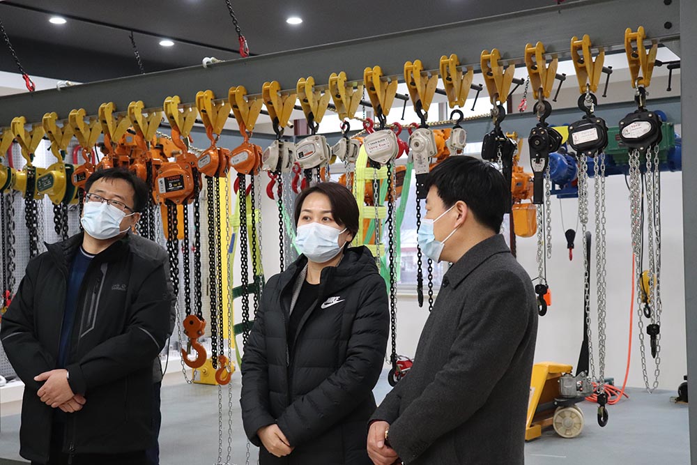 在產品展示廳里,劉丹區長聽取了蘇總經理對吊裝帶、起重鏈條、手拉葫蘆等產品的介紹后,對我公司實力、產品質量表示進一步肯定。同時詢問了公司在